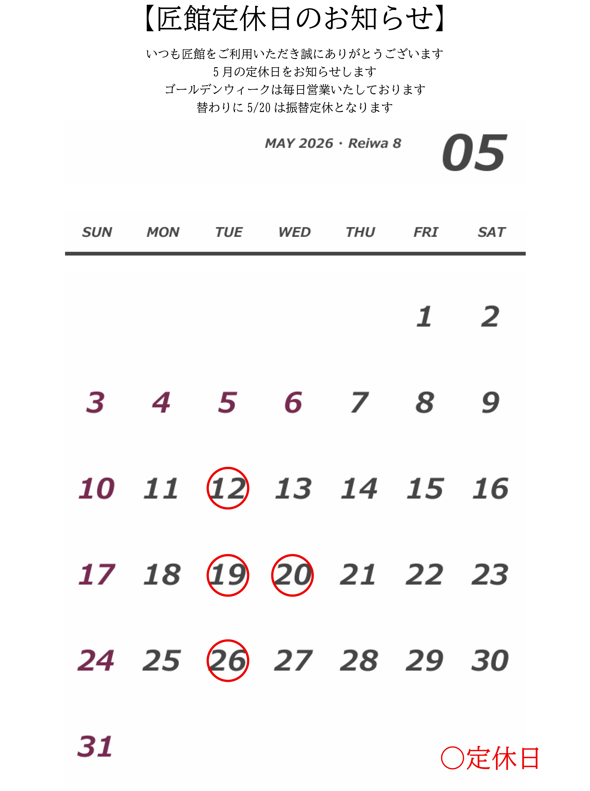 2026年5月 定休日のお知らせ